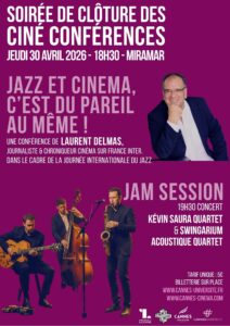 Une Ciné Conférence intitulée « Jazz et cinéma : c’est du pareil au même », menée de main de maître par Laurent Delmas, journaliste et chroniqueur cinéma sur France Inter, sera suivie d’un concert de jazz.